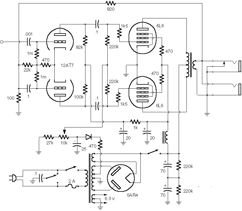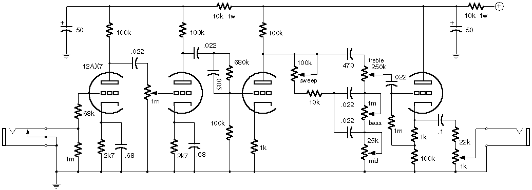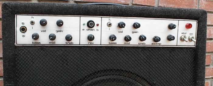 I used several different ideas from different schematic to make this amp. The preamps are basically Marshal design and the power amp circuit is based on a Fender Blackface amp. There are some modifications. For example: I installed a Fixed bias to cathode bias switch. There is also a switch on the global feedback resistor to switch from a 820 ohm resistor to a 100 K resistor that gives the option to practically eliminate global feedback which gives the amp a lot more volume and a more bluesy sound.