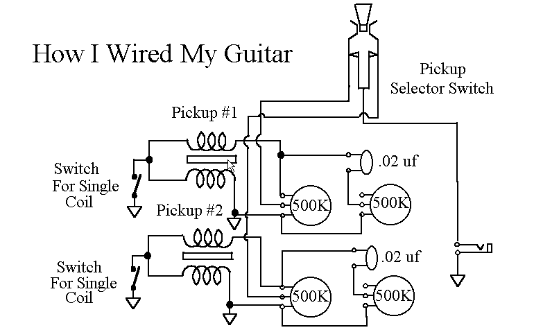 I wired it so I was able to turn one coil off or on in each pickup making it possible to have single coil pickups. Although there are many more options that can be had with more switches, the single coil and double coil option is the most important to me, already giving quite a variety of sounds. When I get more pots with switches in them, I plan to do other things as, switching the phase relationship of the pickups and having the option of connecting the coils in parallel which has a mellower sound. I won't expound on that right now but there is a lot that can be done.